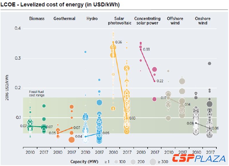 你也可以看到,光热发电与其他能源发电形式相比也越来越有竞争力,LCOE下降较快,这对整个产业而言是个利好的信号。