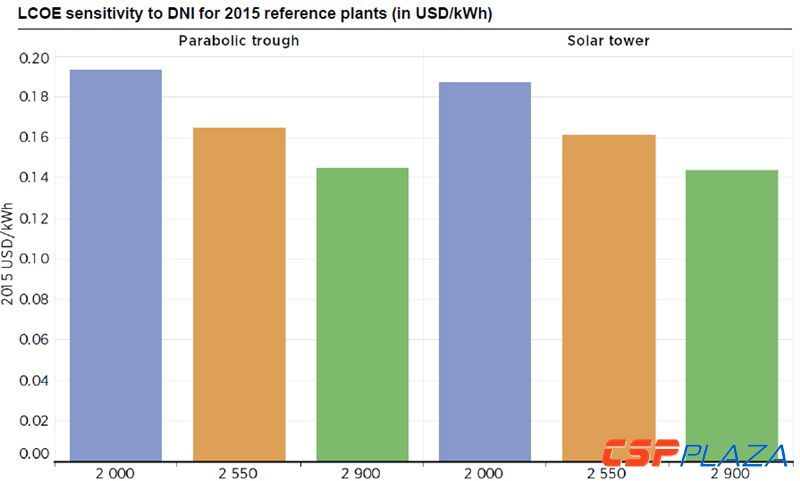 我们看抛物面槽式项目和塔式项目,在光照资源较差的地方,槽式项目LCOE会高出17%,如果在DNI比较高的地点,如图,绿色的柱状图,LCOE下降12%,所以要了解在不同的国家、在新兴市场实现光热项目要优化选址。当然在塔式项目中也可以看到类似的趋势。