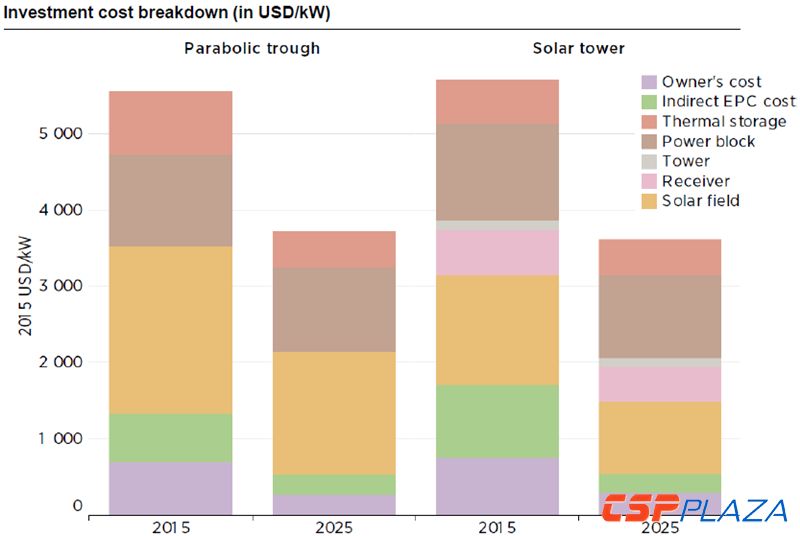 (到2025年)储能7.5小时的槽式系统,在建设总费用方面可以在2025年减少到3700美元/千瓦,储热成本降低40%,而这将得益于未来传热介质向熔盐的转变。塔式上,以储能9小时为例,建设总费用将会在2025年降低到3600美元/千瓦,太阳岛成本降低24%。