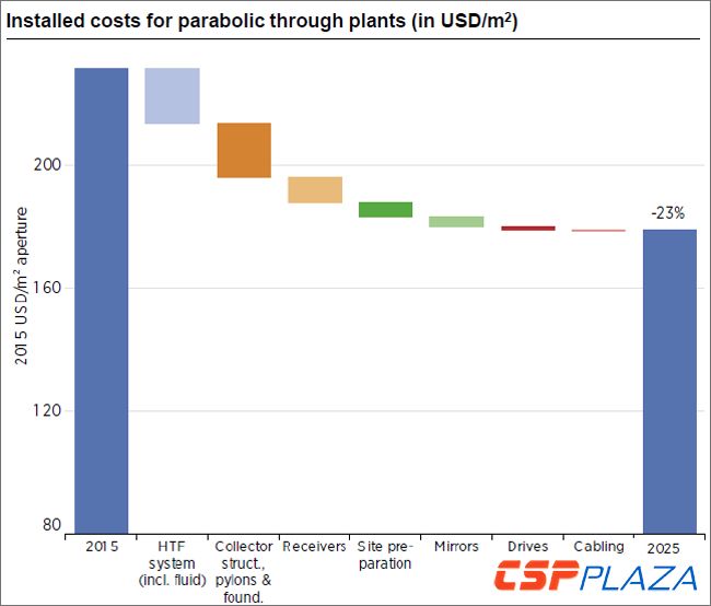 举个例子,抛物面槽式,2025年基准系统包括一个单回路,使用熔盐传热介质、这样可以实现槽式技术更高的性能、更高的发电能力。我们对塔式技术做了类似的分析,塔式也是一样的,我们发现塔式技术和项目也会得益于对太阳岛和常规岛性能的显著提高。具体而言,定日镜的反射率和集热器的效率会进一步的改进,带来更高的运行温度,使得发电岛以及项目总体效率水平提高。