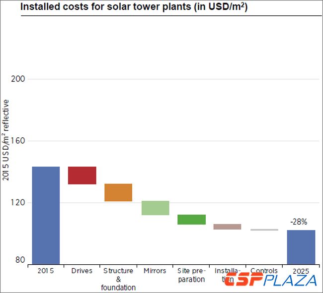 IRENA做了测算,关于太阳岛每平方米当中的成本计算。IRENA发现,槽式技术上,更大的开口宽度和熔盐传热介质,可以降低23%的太阳岛成本。塔式也是非常类似,尤其在新的能源技术项下,通过开发新型驱动和更有效地控制,太阳岛成本可以降低28%。不管是技术的沿革还是管理创新,都可以将成本进一步地降低,如果太阳岛的成本降低,电站毫无疑问可以更好地提升自己的效率,降低电站总体成本。