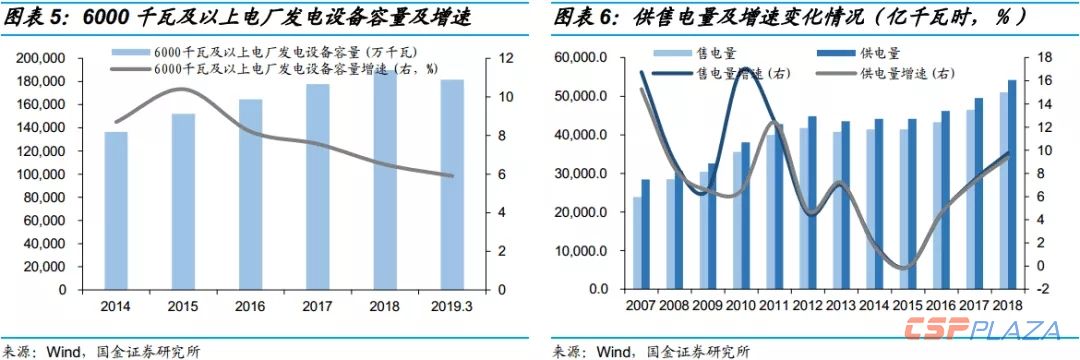 以6,000千瓦及以上电厂发电设备容量测算,从2015年开始,我国电力行业全口径产能保持上升,但增速持续下滑。截至2019年3月末,全国6000千瓦及以上电厂发电设备容量189,967万千瓦,同比增长6.90%,增速较上年减少0.6个百分点。电厂发电设备容量的不断增长带来了供电量的上升,2016-2018年全国供电量分别为46,176.58、49,544.2、54,194亿千瓦时,同比增长4.57%、7.29%、9.76%。