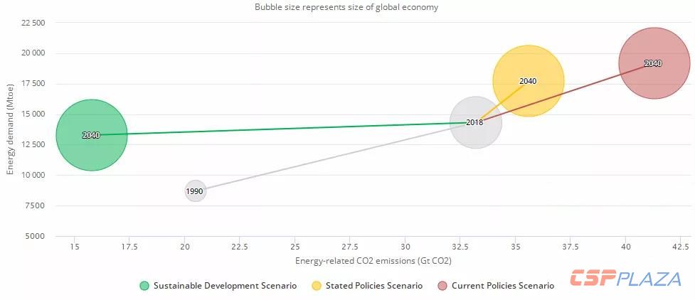 “当前政策情景”描绘世界继续沿着当前的路径发展,各国政府不对政策进行任何新的调整,全球能源将如何发展。在此情景中,2040年之前,全球能源需求年均增速为1.3%,进一步提高能效的努力并不能抑制能源需求的不断增长。虽然这一增速远低于2018年2.3%的增速,但这将导致能源相关排放持续上升,能源安全所涵盖的各方面压力也都将不断增大。