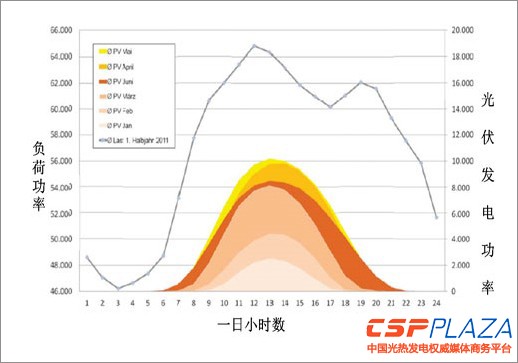德国用电负荷功率(黑线)和光伏发电功率(彩色颜色表示不同月份)图