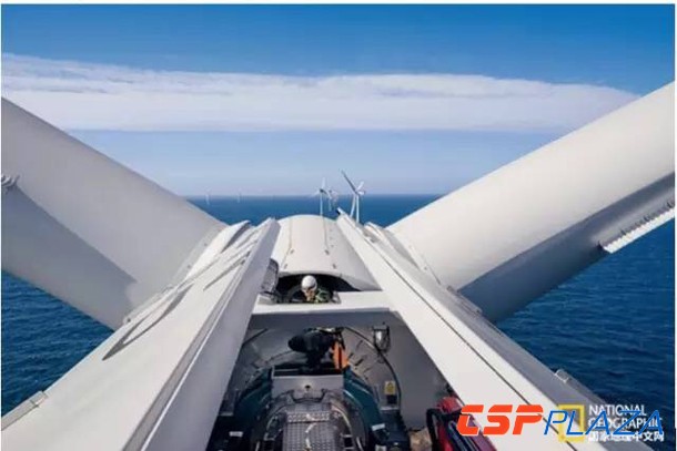 距德国大陆50公里、北海海面上空约90米处,一名工程师在检修由丹麦DONG能源集团运营的风电涡轮机。德国在北海、波罗的海建成及在建的风力发电场已有19 处。