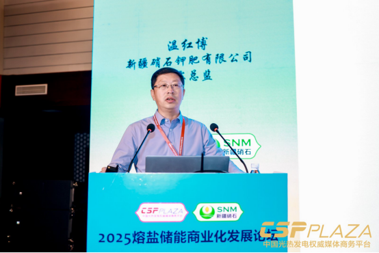 在近日召开的2025熔盐储能商业化发展论坛上,新疆硝石钾肥有限公司(以下简称:新疆硝石)技术总监温红博作《熔盐的材料特性、生产工艺与质量控制经验分享》主题报告,结合多年实际项目供货经验详细分享了光热发电/熔盐储能领域所用的熔盐材料的特性、主