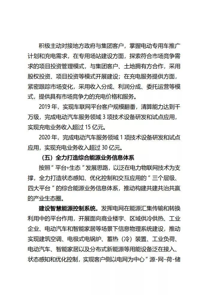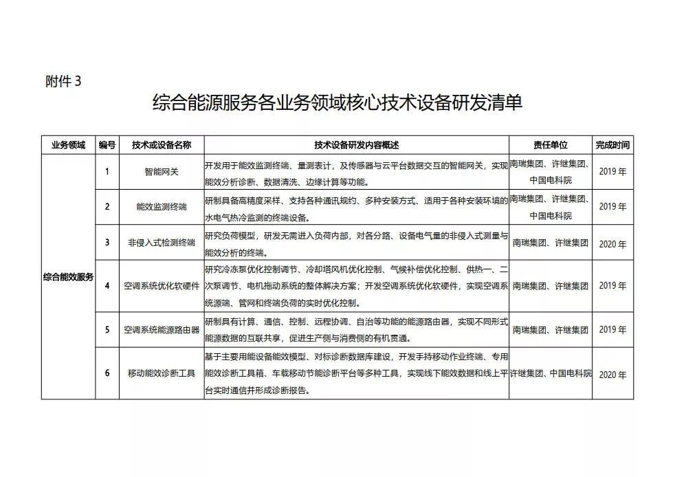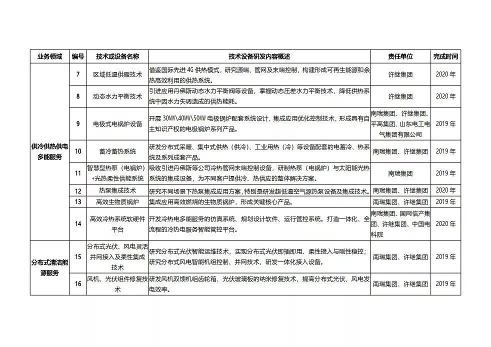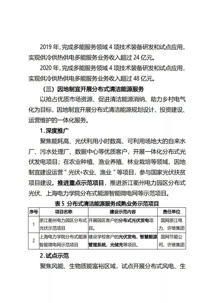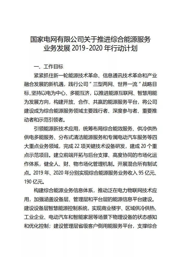《行动计划》表示,国家电网将引领能源新技术应用,统筹布局综合能效服务、供冷供热供电多能服务、分布式清洁能源服务和专属电动汽车服务等四大重点业务领域,完成22项关键技术设备研发,建成20个重点示范项目。建立前端开拓与后台支撑、高度协同的市场化运作体系,健全人、财、物市场化管理机制。开展混合所有制试点。2019年、2020年分别实现综合能源服务业务收入95亿元、190亿元。