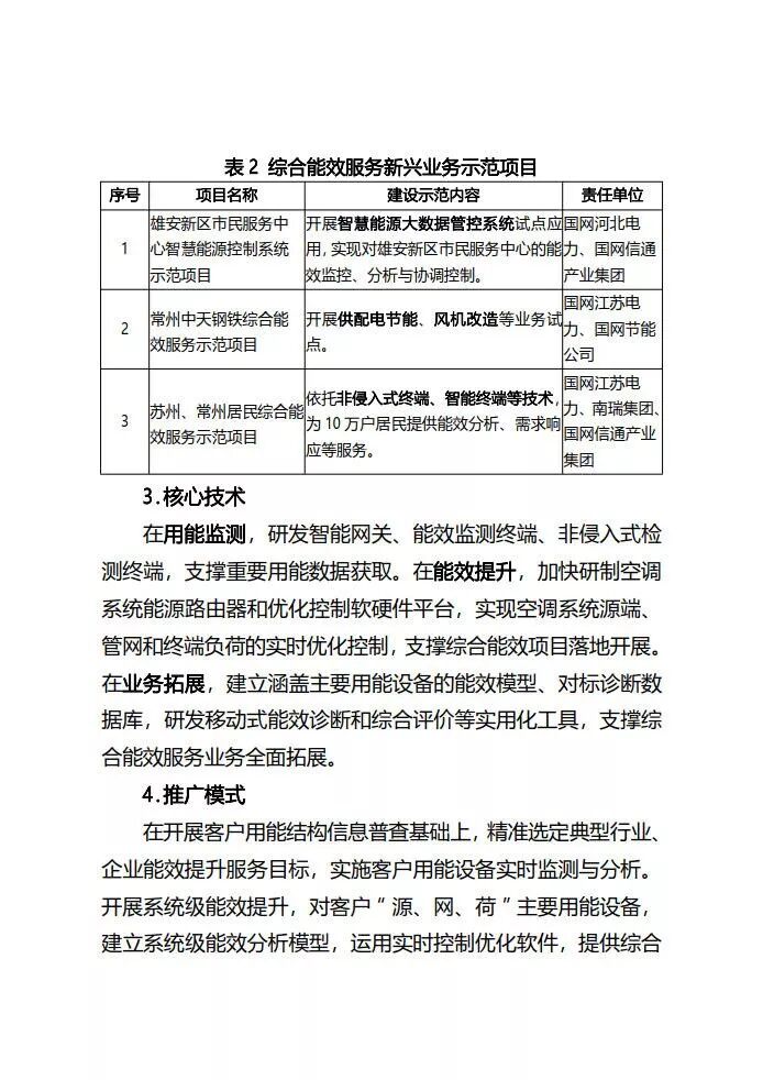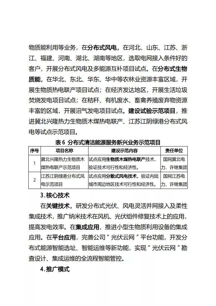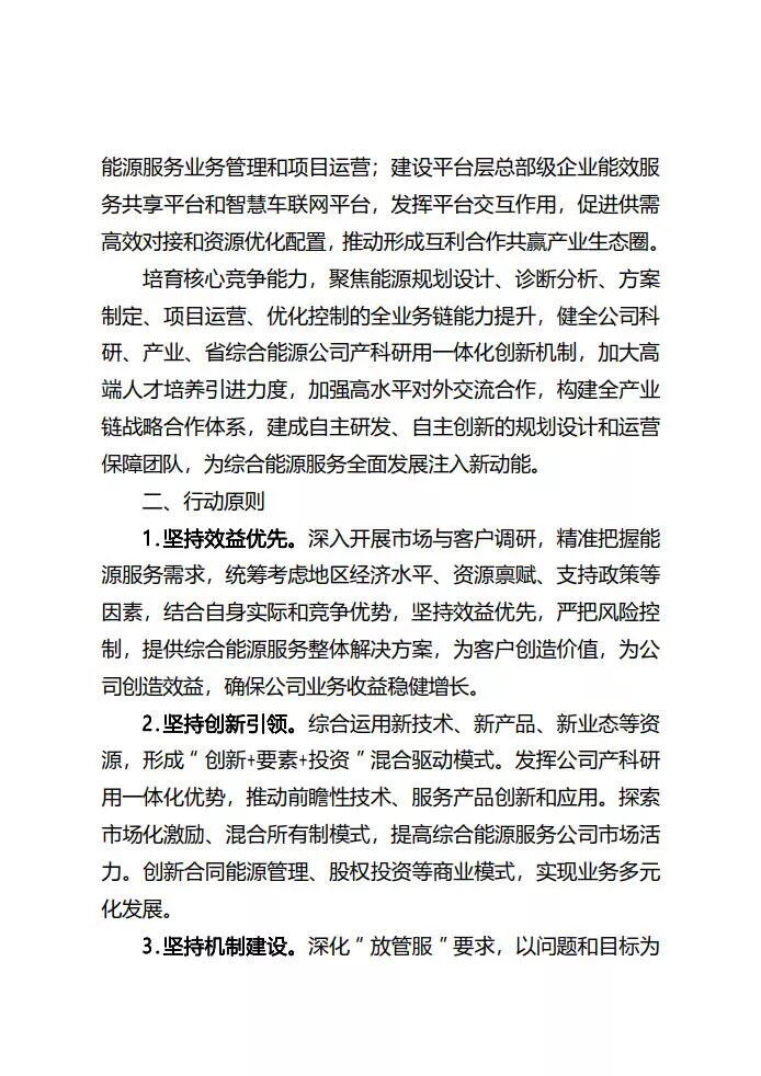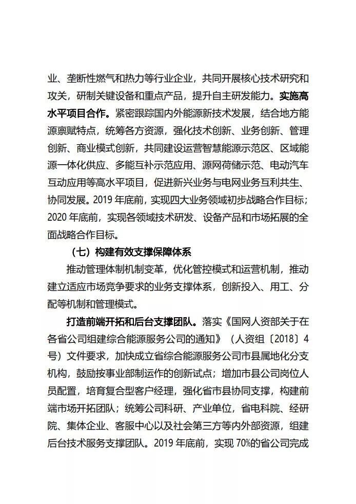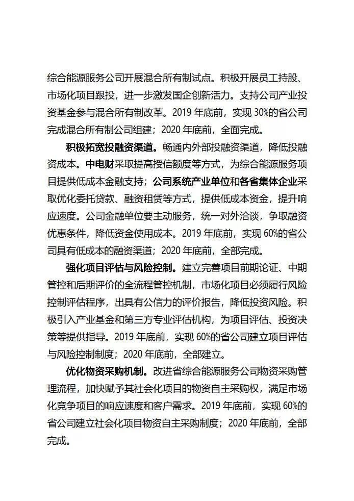 《行动计划》表示,国家电网将引领能源新技术应用,统筹布局综合能效服务、供冷供热供电多能服务、分布式清洁能源服务和专属电动汽车服务等四大重点业务领域,完成22项关键技术设备研发,建成20个重点示范项目。建立前端开拓与后台支撑、高度协同的市场化运作体系,健全人、财、物市场化管理机制。开展混合所有制试点。2019年、2020年分别实现综合能源服务业务收入95亿元、190亿元。