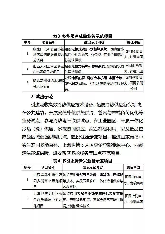 《行动计划》指出,国家电网将引进吸收高效冷热供应技术设备,拓展冷热供应新兴领域,在公共建筑领域,开展光热补偿供热供冷、管网与末端负荷优化等业务试点,参与冷热电三联供试点。在工业园区,开展一体化冷热(暖)供应、多功能协同效应、综合提及利用,以及低品位热源区域低温供暖试点。建设试验示范项目,推进山东青岛中德生态园多能互补、上海世博B片区央企总部能源中心、西藏清洁能源供暖、雄安新区多能服务等试点示范项目。