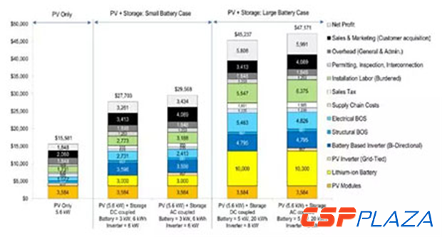 我们发现,使用5.6千瓦太阳能光伏板和3千瓦/6千瓦时锂离子电池的小型电池案例的基准价格大约是单一的与电网相连的5.6千瓦太阳能光伏系统的2倍(详情请参考图1)。对新装太阳能光伏+储能系统而言,直流系统的价格(27,703美元)比交流系统的价格(29,568美元)低1,865美元。交流系统的价格溢价主要是由于交流配置所需的额外并网换流器造成的硬件和人工成本。然而,在对比交流与直流系统时,安装价格并不是唯一的考虑因素:交流系统在光伏能源即发即用的应用中效率更高,而直流系统则在光伏能源储存储的应用中更有效率。