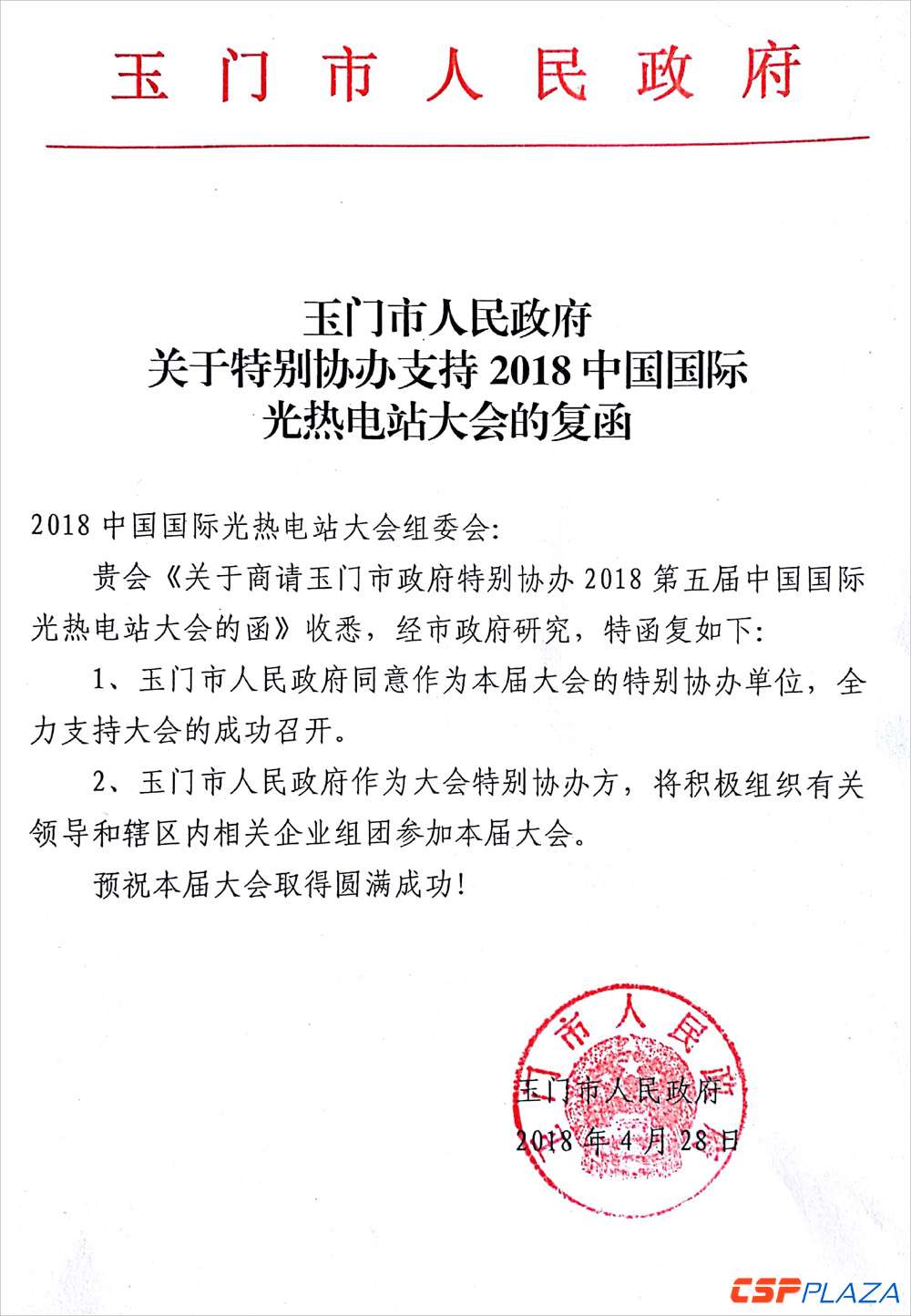 CSPPLAZA光热发电网讯:4月28日,甘肃省玉门市人民政府函复2018中国国际光热电站大会组委会,确认将作为本届大会的特别协办单位全力支持大会的成功召开。作为大会特别协办方,玉门市人民政府将积极组织有关领导和辖区内相关企业组团参加本届大会。