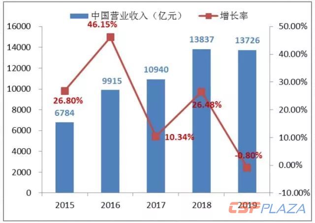 从收入规模看,中国入选企业总营业收入达13726亿元(2018:13837亿元),比去年减少111亿元(2018:+2897亿元),2014年后,首次出现负增长,增长率为-0.8%(2018:26.48%),比去年降低27.28个百分点(2018:+16.14个百分点)。
