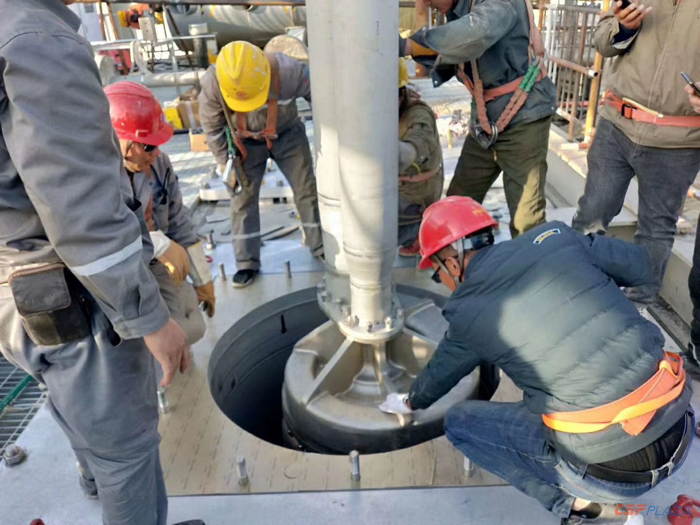 CSPPLAZA光热发电网讯:10月29日17时34分,兰州大成敦煌50MW光热发电示范项目第一台热罐熔盐泵顺利吊装就位。