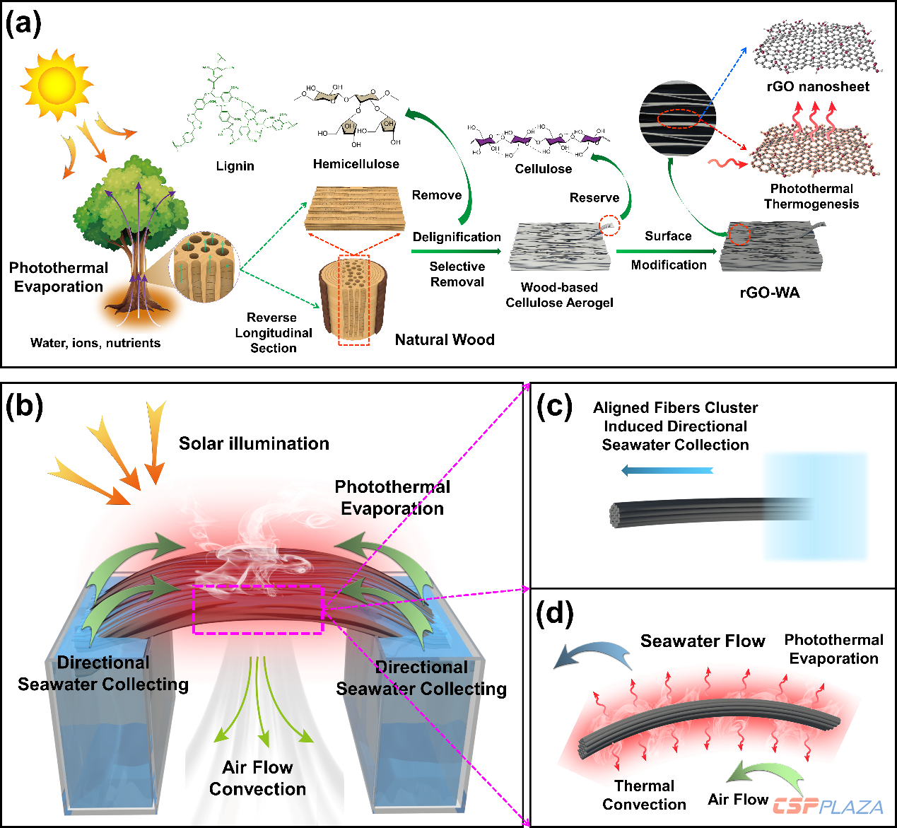 基于上述实际应用需求与当前研究存在的问题,研究人员利用天然木材纤维定向排列的结构特点,通过选择性去除木质素、半纤维素后,制备得到了同时能够定向高效收集海水且可弯折卷曲的木材衍生天然气凝胶材料,其表面修饰光热涂层后能够高效地进行光热转换激发的海水蒸发。
