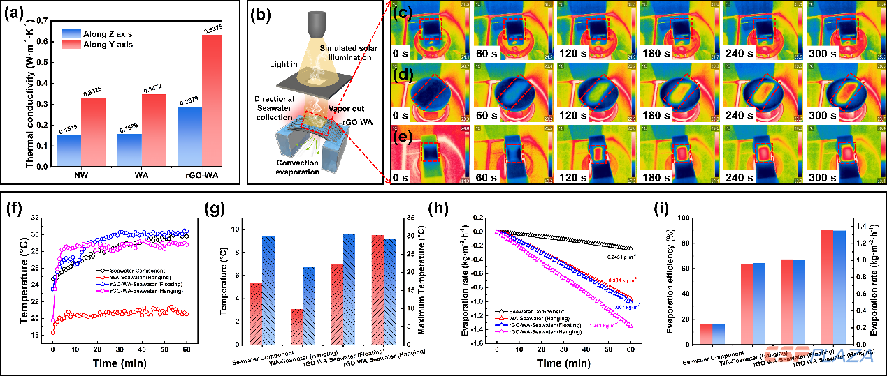 图3.(a)天然木材、木材气凝胶与还原氧化石墨烯修饰的木材气凝胶沿X与Z轴的导热系数。(b)由光热转换和自然对流驱动的光热蒸发系统示意图。(c)海水-空气界面的红外热成像图,(d)漂浮在海水上的还原氧化石墨烯修饰的木材气凝胶的红外热成像图,(e)悬挂在海水槽之间的还原氧化石墨烯修饰的木材气凝胶的红外热成像图。(f)海水,海水槽之间悬挂的木材气凝胶,漂浮在海水上的还原氧化石墨烯修饰的木材气凝胶以及悬挂在海水槽之间的还原氧化石墨烯修饰的木材气凝胶的蒸发界面的温度变化。(g)上述四种条件下的蒸发率。(h)上述四种条件下的蒸发效率和蒸发速率比较。(i)上述四种情况的总温升、气液界面最高温度。