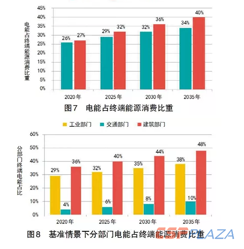 交通部门随着电动汽车大规模普及以及电气化轨道交通的持续发展,电气化水平将大幅提升。建筑部门随着电采暖、电制冷、电炊具、电热水设备的不断推广应用,电气化水平将持续提升。此外,数字经济产业加速发展,可再生能源发电制氢等新产业不断成熟壮大,将进一步促进全社会电气化水平提升。预计2035年我国电能占终端能源消费的比重有望达到34%左右。