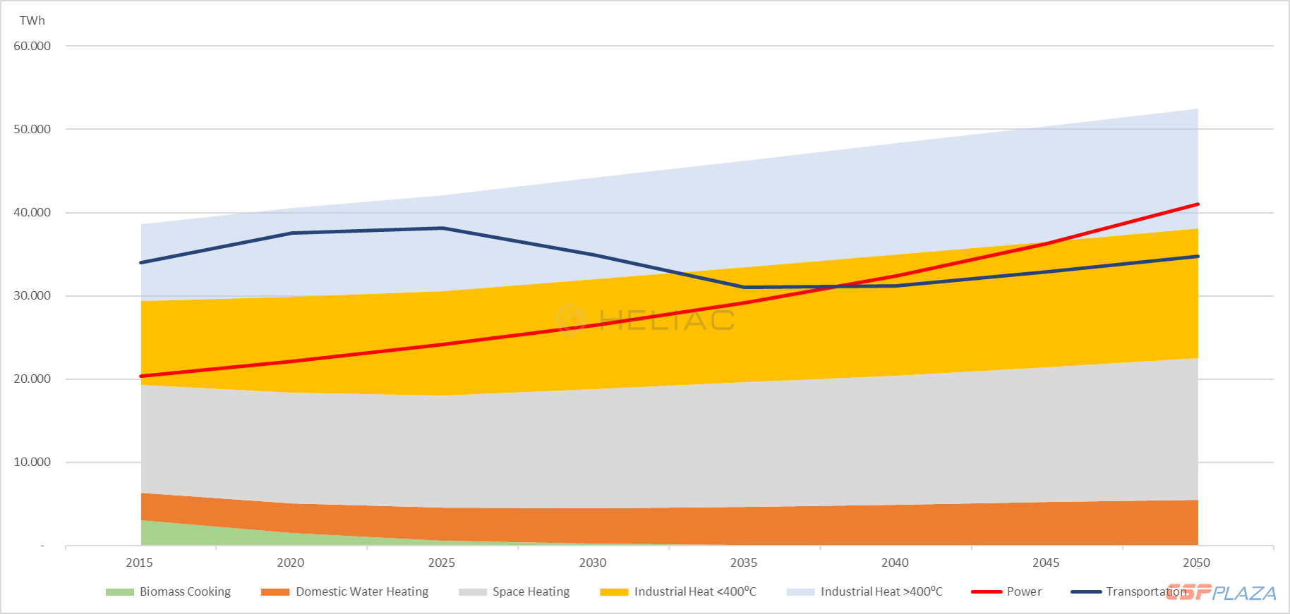 首先,看一下截至2050年能源市场的发展情况。请注意,尽管电气化程度不断提高,但低于400⁰C热能的年需求量,依然稳步保持在略高于10,000TWh的水平。