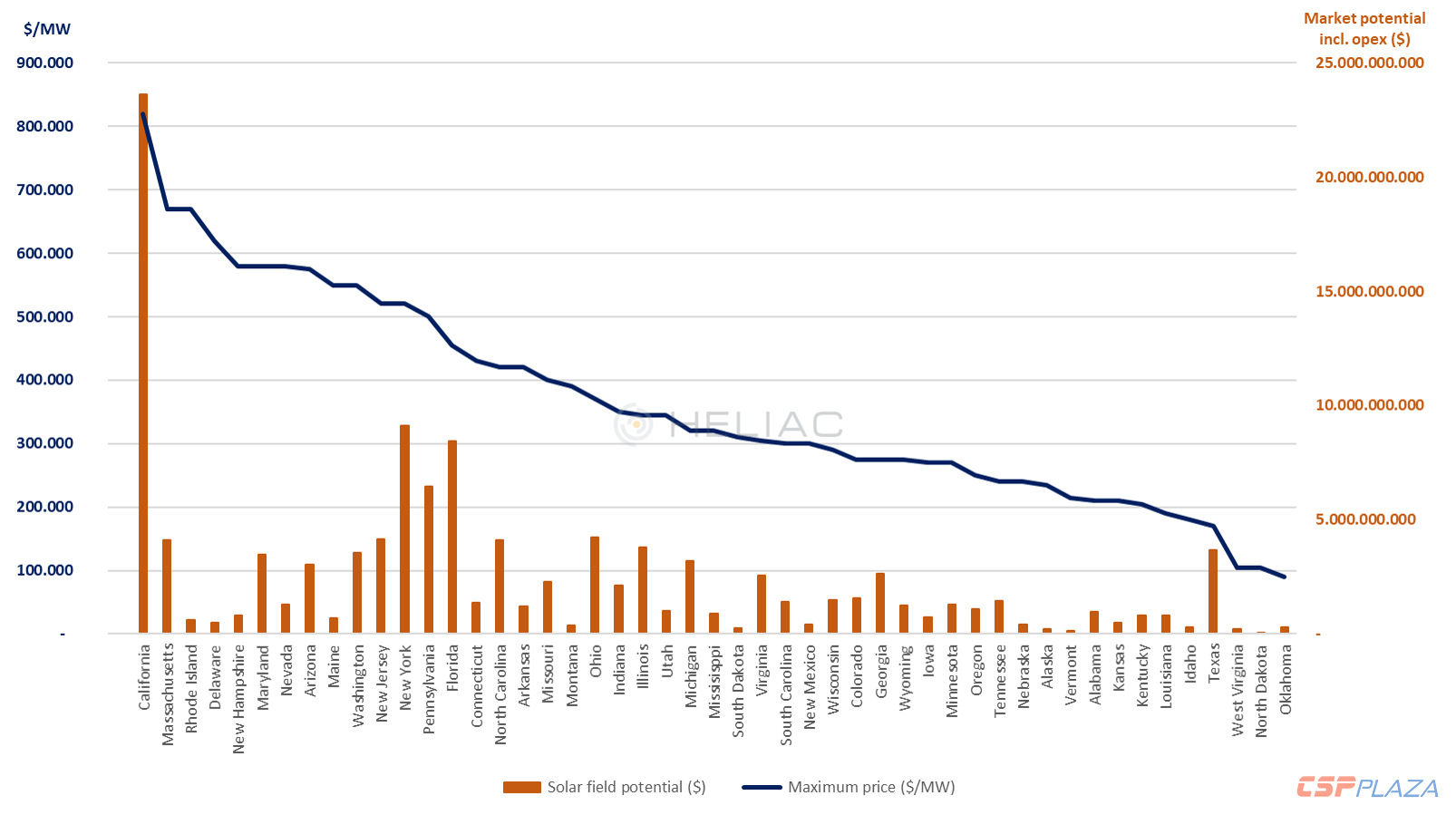 太阳能光热的成本在很大程度上取决于光照资源。但是,最终用户只会将太阳能光热的成本与天然气产生的热能相比。如上所述,对于美国而言,这意味着价格在$8-34/MWh的范围内,在欧洲约为$35/MWh。假设在最相关的州中,天然气的平均价格为25美元,在下图中绘制了无补贴的成本目标(以美元/MW为单位)与太阳辐射的关系。