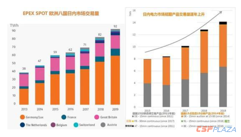电力市场也不断发展,来更好的适应波动性较大的可再生能源发电量的逐渐增加。除日前市场外,日内交易市场近年来逐渐活跃,交易产品种类也从拍卖和小时合约扩展到更细分的15分钟和30分钟交易,使得市场参与者能够在实时电力平衡前最大限度的调整风电和光伏出力的预测误差。