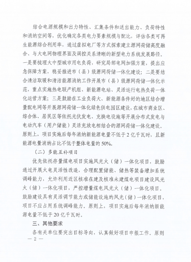 二是要结合清洁取暖和清洁能源消纳工作开展市(县)级源网荷储一体化示范,重点实施热电联产机组、新能源电站、灵活运行电热负荷一体化运营方案;