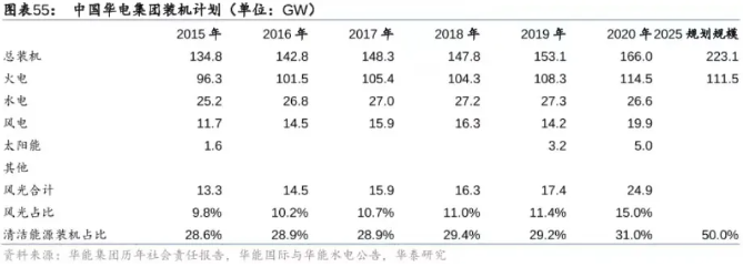 众所周知,目前我国电源结构仍以煤电为主,提高可再生能源发电占比,是电力部门实现能源减排的必由之路。华电集团作为五大发电集团之一,主要包含火电、风电和水电三种类型。尤其火电装机占比普遍较高,转型任务重。据了解,截至2020年末,华电集团的火电装机在70%左右,集团可再生能源占比仅约为31%。