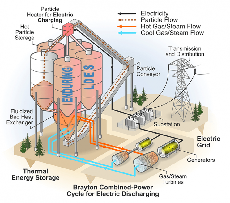 如上图,沙子被加热之后就会被送入混凝土制成的绝缘筒仓进行储存。当需要释放所储存能量时,沙子会被送入一个热交换器,然后通过热交换将气体加温增压,以为涡轮机械和旋转发电机提供动力并产生电力。