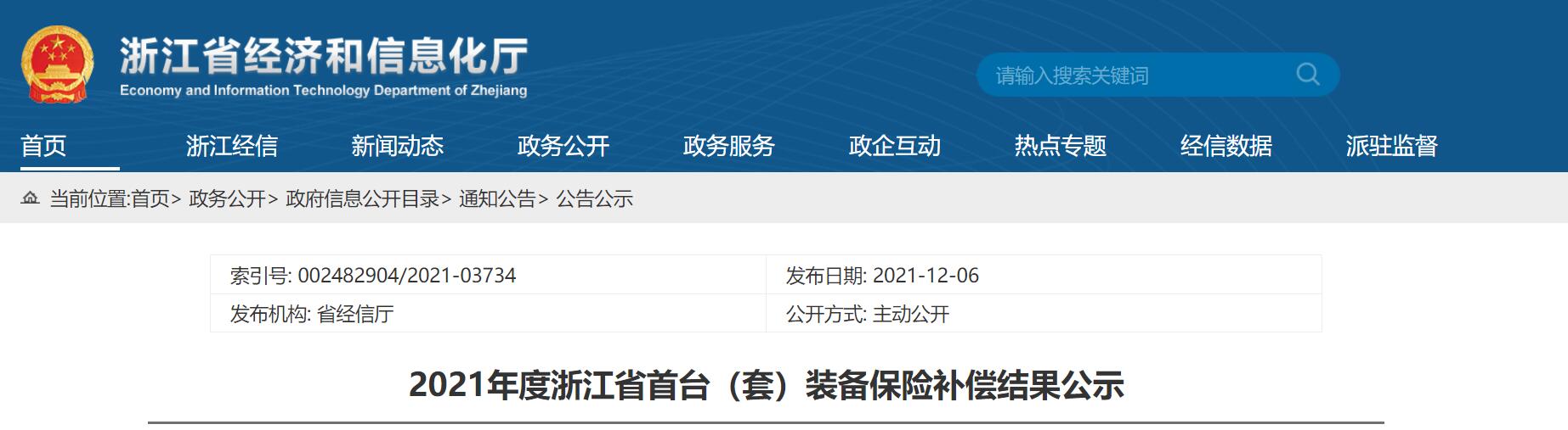 12月6日,浙江省经济和信息化厅发布《2021年浙江省首台(套)装备保险补偿项目公示名单》。