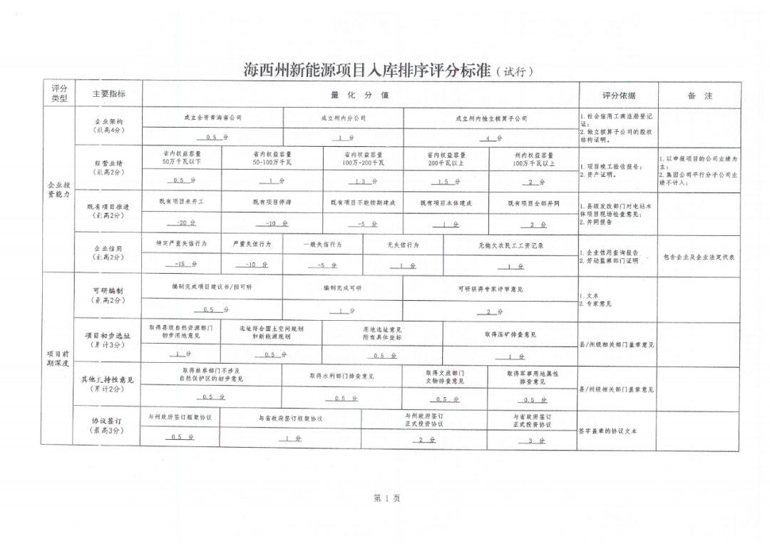 近日,青海海西州发改委印发《新能源项目入库排序评分标准》,通过八大类35小项的评分类型对新能源项目进行评分排序。