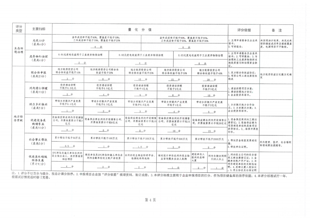 根据文件,其评分内容主要包括企业投资能力、项目前期深度、荷储网源、多能互补、产业协同带动、生态治理以及地方经济贡献等八大类,各类项目下面细小划分35个小项。不同类别之间设置不同分值,以总得分计算排序。