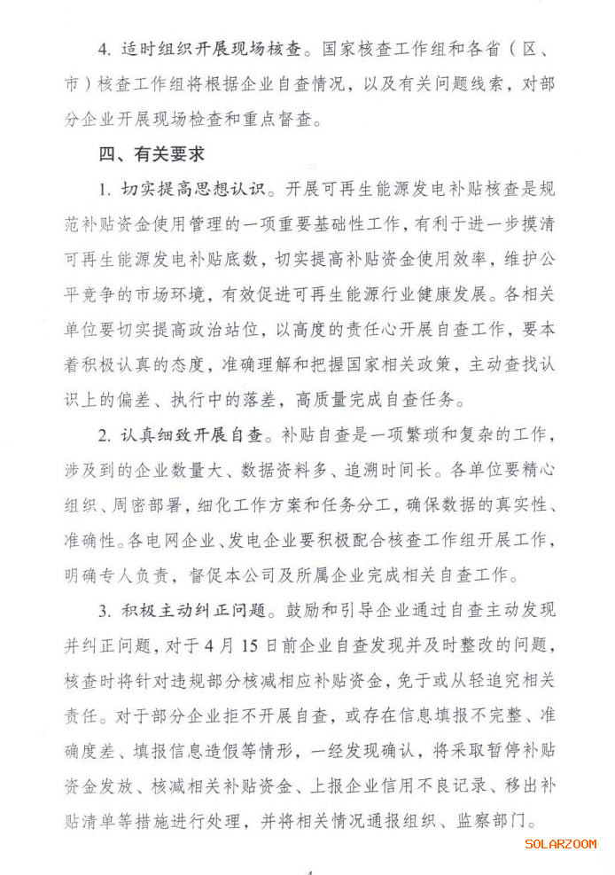 文件表明,开展可再生能源补贴核查是规范补贴资金使用管理的一项重要工作,有利于进一步摸清可再生能源发电补贴底数,提高使用率。鼓励企业通过自查主动发现并纠正问题,于4月15日之前上报并整改可针对违规部分核减相应补贴资金,或免于处罚。若局部开展自查或整改,将暂停补贴资金发放或核减相关补贴资金。