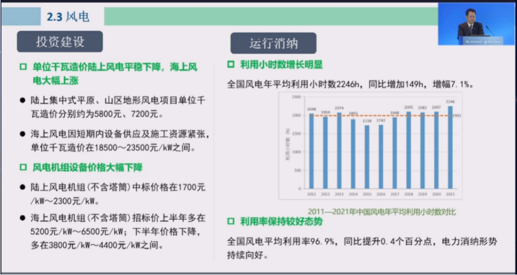 价约5800元/千瓦,山区地形为7200元/千瓦,不含塔筒的价格在1700~2300元/千瓦。海上风电造价在18500~23500元/千瓦之间,上半年不含塔筒的价格在5200~6500元/千瓦,下半年在3800~4400元/千瓦之间。其全年平均利用小时数为2246小时,同比增加149小时,增幅为7.1%。全国风电平均利用率为96.9%,同比提升0.4个百分点。