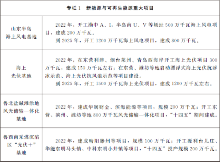 (1)加快风光“四基地、两示范”建设。坚持海陆并进、集散并举,大力发展风电、光伏发电。到2025年,光伏发电、风电装机分别达到6500万千瓦、2800万千瓦;到2030年,分别达到1.25亿千瓦、5500万千瓦。海上风电基地。打造山东半岛海上风电基地,聚焦渤中、半岛南、半岛北三大片区,以省管海域为重点,加快启动首批千万千瓦海上风电项目建设,逐步推动海上风电向深远海发展。探索推进海上风电军民融合发展新模式。2022年,海上风电开工500万千瓦,建成200万千瓦左右。到2025年,开工1200万千瓦,建成800万千瓦;到2030年,建成3500万千瓦。海上光伏基地。按照“由近及远、由易到难、示范先行、分步实施”思路,以滨州、东营、潍坊、烟台等市近海海域为重点,采用渔光互补、多能互补等模式,推动桩基固定式海上光伏项目开发建设。结合海上风电开发布局,在具备条件的海域开展漂浮式海上光伏示范,打造“风光同场”海上清洁能源基地。2022年,海上光伏开工300万千瓦,建成150万千瓦左右,启动漂浮式海上光伏示范工作。到2025年,开工1500万千瓦,建成1200万千瓦左右;到2030年,建成4000万千瓦左右。鲁北盐碱滩涂地风光储输一体化基地。充分利用潍坊、滨州、东营等市的盐碱滩涂地和菏泽等市的黄河滩涂地,推进风电、光伏、储能等一体化设计、建设和运营。到2025年,建成1000万千瓦以上;到2030年,总开发规模达到2500万千瓦。鲁西南采煤沉陷区“光伏+”基地。以济宁、泰安、枣庄、菏泽等市采煤沉陷区为重点,采用渔光互补、农光互补、生态治理等融合发展模式,推进光伏发电基地建设。到2025年,基地光伏发电装机达到300万千瓦;到2030年,达到500万千瓦。整县分布式光伏规模化开发示范。全面启动沂水、诸城、嘉祥等70个国家试点县建设工作,推动党政机关、公共建筑、工商业厂房和农村居民屋顶等分布式光伏开发建设。到2025年,50%以上试点县达到国家标准,开发规模达到2000万千瓦以上;到2030年,试点县全部达到国家标准,总开发规模达到3000万千瓦以上。“百乡千村”绿色能源发展示范。统筹推进乡村太阳能、生物质能、地热能等可再生能源多元化综合开发利用,打造农村地区用电、取暖、炊事等一体化清洁用能新模式。到2025年,建成100个左右“标杆乡镇”和1000个左右“标杆村”;“十五五”期间,乡村绿色能源发展模式得到全面推广。(牵头部门:省能源局,配合部门:省发展改革委、省住房城乡建设厅、省水利厅、省农业农村厅、省海洋局)