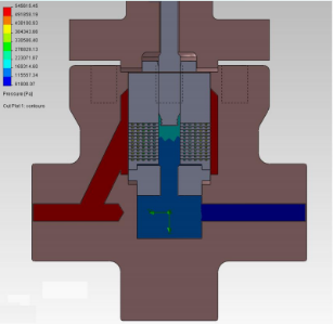上图为压力分布云图,经过流体分析软件模拟而得。从图中可以看出,颜色深的为高压(入口压力),蓝色为低压(出口压力)。出口压力是根据设计提供的参数确定的。压力的分布是逐级减小,而在两股液体相撞时会偏高。