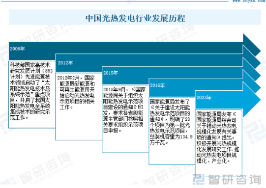 从行业发展历程看,2006年,科技部国家高技术研究发展计划(863计划)先进能源技术领域启动了“太阳能热发电技术及系统示范”重点项目,开启了我国太阳能热发电全系统集成技术的研究示范工作,为我国光热发电技术发展奠定了基础。2021年,我国第一个太阳能热发电工程项目——鄂尔多斯50MW槽式太阳能热发电项目完成特许权示范招标。中标电价过低,该项目未能建设,但特许权项目的启动引发了更广泛的市场关注和行业期待,带动华能、华电、中广核等国企及龙腾光热、中海阳等民营企业开始布局光热发电行业。随着电力需求持续增加,电力安全供应形势越发严峻,我国在“十二五”电力规划中提出,到2015年实现光热发电装机容量100万千瓦。2012年7月,科技部“十二五”主题项目,“太阳能槽式集热发电技术研究与示范”项目启动,我国开始对兆瓦及槽式光热发电技术进行研究示范。2016年,国家能源局正式确定首批20个光热发电示范项目,并获国家发改委共同提出了“十三五”期间5GW的光热发电装机目标,推动产业发展进入新台阶。