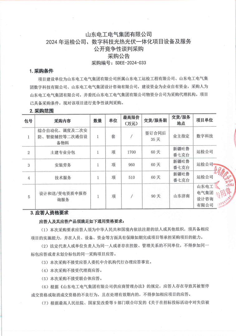 CSPPLAZA光热发电网讯:3月14日,山东电工电气集团有限公司2024年运检公司、数字科技光热光伏一体化项目设备及服务发布公开竞争性谈判采购公告。