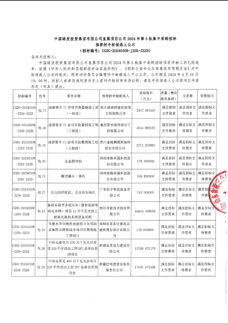 4月16日,中国绿发投资集团有限公司直属项目公司就2024年第5批集中采购招标发布中标候选人公示。