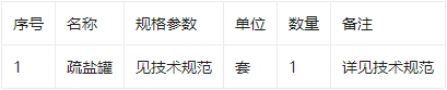 疏盐罐设备本次采购将由成交人承包提供疏盐罐设备和附件,包括设备及供货范围内所有设备及元器件的选择、设计、制造、试验(包括型式试验、出厂试验、交接试验)、供货、包装、运输、现场交接;提供指导安装和调试、现场技术培训;指导现场试验和验收、参加试运行和协助交接验收;负责产品资料文件编制和提交等,详见下表。