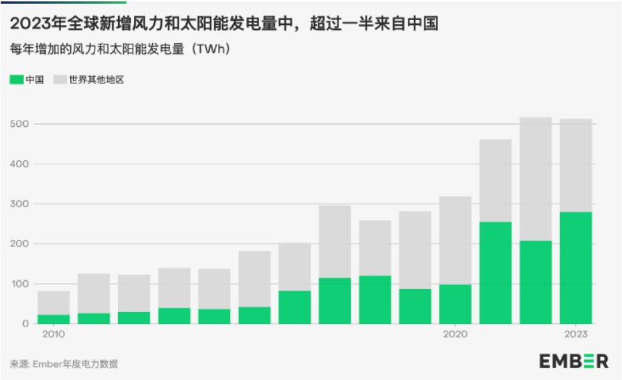 2023年,中国的太阳能和风力发电量占全球的37%,燃煤发电量占全球的一半以上。2023年中国新增风力和太阳能发电量占全球一半以上。如果没有自2015年以来风力和太阳能发电量的增长,2023年中国电力行业的排放量将会提高21%。