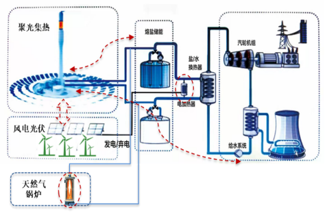 光热发电“电-热-电”能量转化过程,使其更易于与卡诺电池技术、天然气耦合发电技术等新技术融合:增设电熔盐加热装置,实现与风电光伏能量互通,提高新能源利用率;与天然气耦合发电,提升资源条件不佳情况下,系统保供能力。