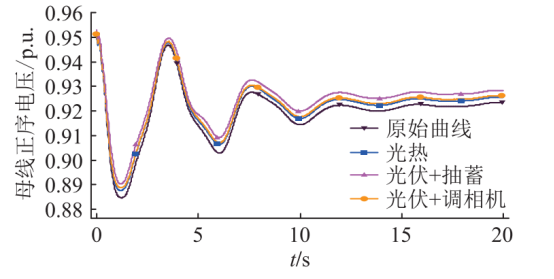 对于高比例新能源系统,系统频率稳定依靠接入电网中的发电机、调相机等旋转设备调节。根据目前已投运50MW光热电站的参数统计,其转动惯量约为50Mvar分布式调相机的2.39倍,X”d约为分布式调相机的1.42倍。可为系统提供紧急无功电压支撑,有助于直流输电功率和系统主要节点电压迅速恢复,防止引起电压崩溃。
