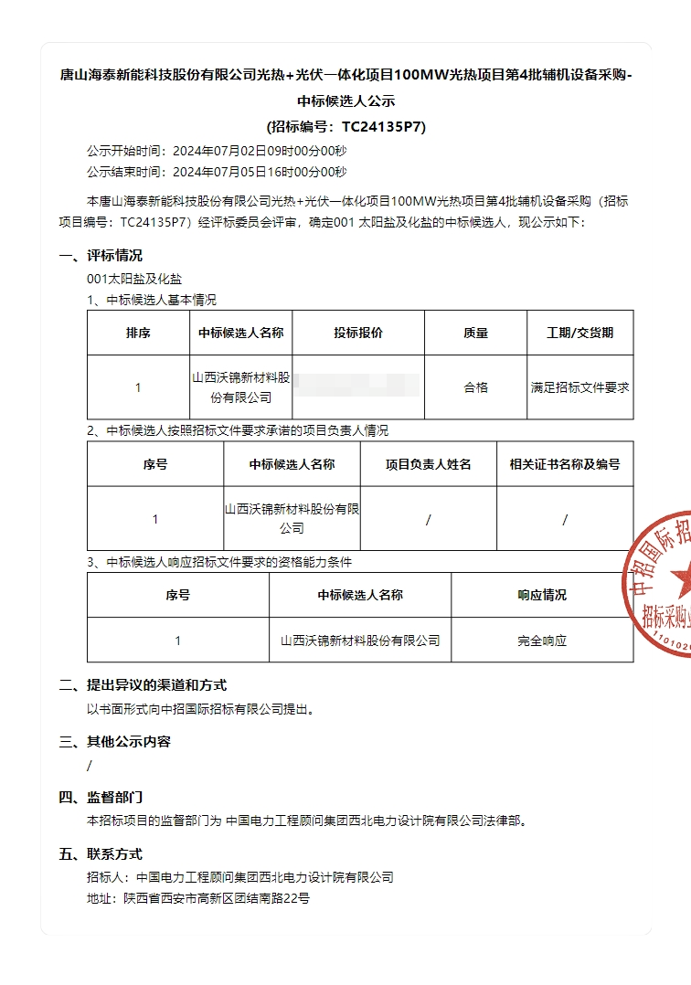 7月2日,唐山海泰新能科技股份有限公司就光热+光伏一体化项目100MW光热项目第4批辅机设备采购发布中标候选人公示,其中,太阳盐及化盐的中标候选人为CSPPLAZA平台会员单位——山西沃锦新材料股份有限公司(并盛化工)。