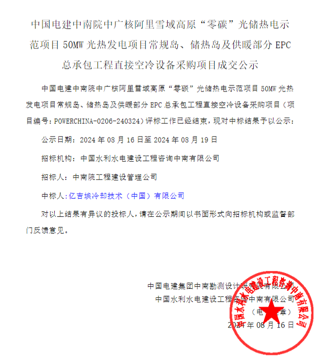 8月16日,中南院工程建设管理公司就中广核阿里雪域高原“零碳”光储热电示范项目50MW太阳能热发电与供暖工程常规岛、储热岛及供暖部分EPC总承包工程直接空冷设备采购项目发布成交公示。中标人为亿吉埃冷却技术(中国)有限公司。