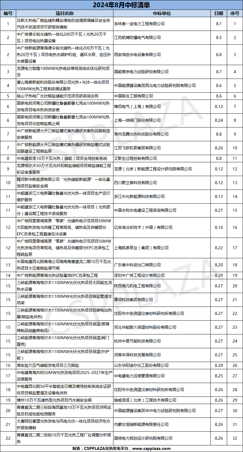 8月:2024年8月光热/熔盐储热相关中标项目及单位一览【可点击标题查看详情】