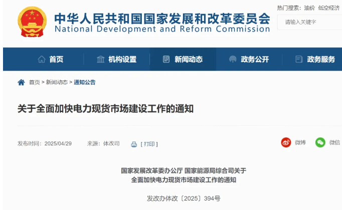 4月29日,国家发展改革委办公厅、国家能源局综合司发布《关于全面加快电力现货市场建设工作的通知》,通知指出,湖北电力现货市场要在2025年6月底前、浙江电力现货市场要在2025年底前转入正式运行,安徽、陕西力争在2026年6月底前转入正式运行。2025年底前,福建、四川、辽宁、重庆、湖南、宁夏、江苏、河北南网、江西、河南、上海、吉林、黑龙江、新疆、蒙东、青海要启动现货市场连续结算试运行。