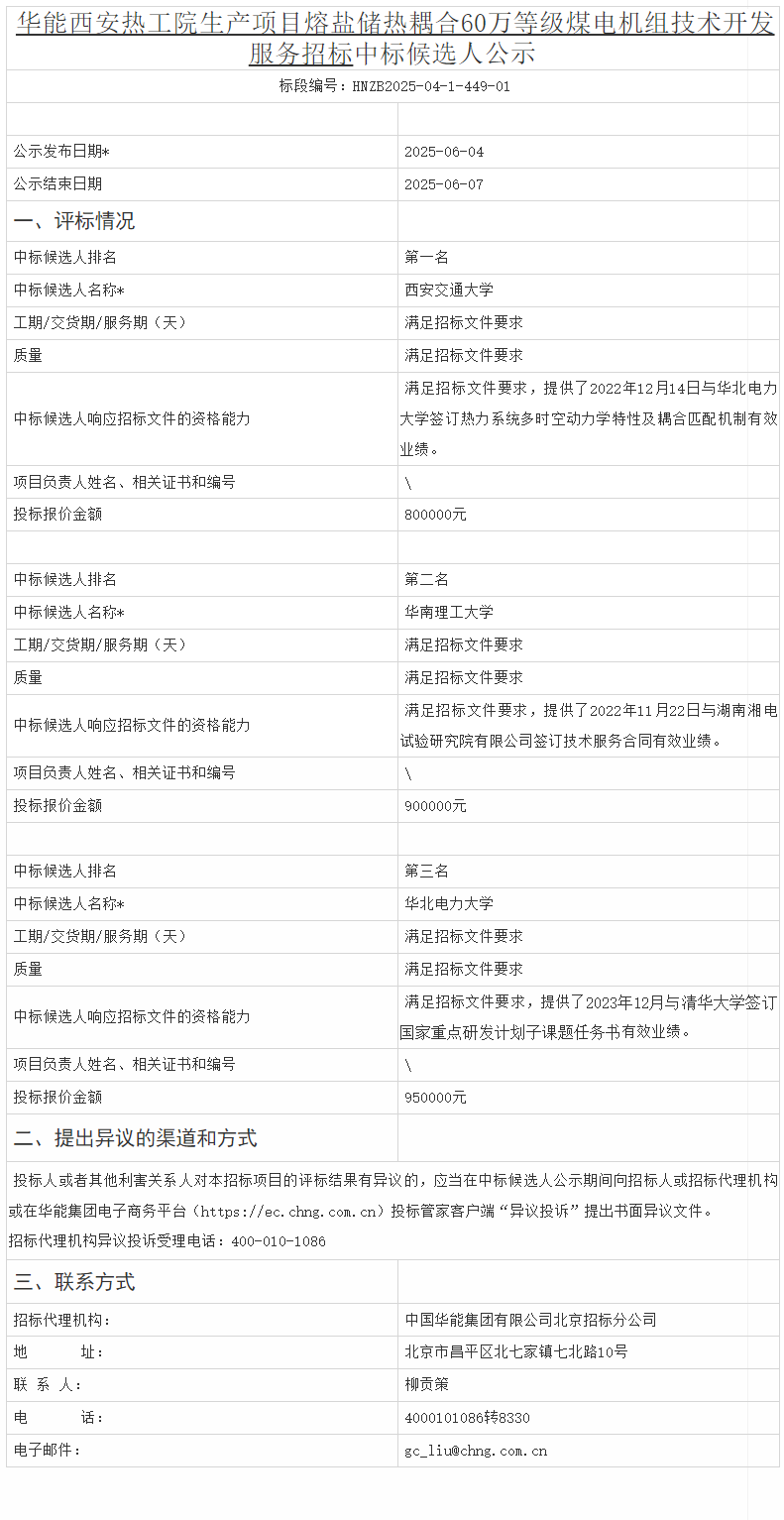 6月4日,华能西安热工院生产项目熔盐储热耦合60万等级煤电机组技术开发服务招标项目发布中标候选人公示,候选人第一名为西安交通大学,投标报价金额为800000元。