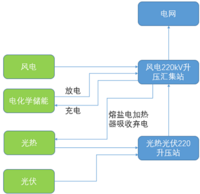 如上图所示,在调度模型中,主要以光热和光伏共用升压站,风电和电化学储能共用升压站,其中光热主要通过熔盐电加热器吸收弃电。