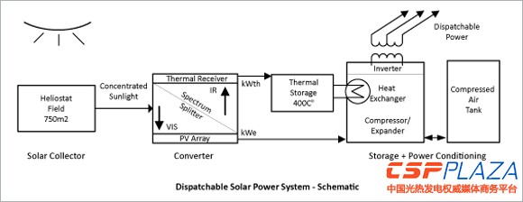 RayGen的CSPV技术集合了光热发电可廉价存储、光伏发电成本较低的双重优势。750倍的聚光能量照射在高效聚光太阳能电池板上,一平方米的电池板可产出的电能是同等面积的普通电池板的1500倍。置于塔顶的能量吸收器分为两个部分,上层部分为热量吸收器,主要吸收红外辐射,下层部分为聚光光伏电池板,主要吸收可见光发电。吸收的热量存入储热系统,聚光光伏电池发出的电能用压缩机来压缩空气存入压缩空气罐中,发电时释放压缩空气中的空气驱动空气透平发电,同时利用储热系统加热空气,空气受热膨胀做功,发电效率大幅提升。