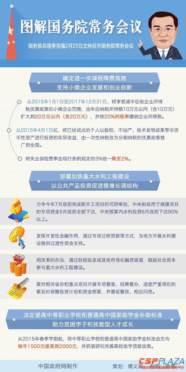 国务院总理李克强2月25日主持召开国务院常务会议,确定进一步减税降费措施、支持小微企业发展和创业创新,部署加快重大水利工程建设、以公共产品投资促进稳增长调结构,决定提高中等职业学校和普通高中国家助学金补助标准、助力贫困学子和技能型人才成长。