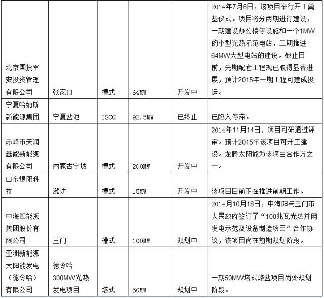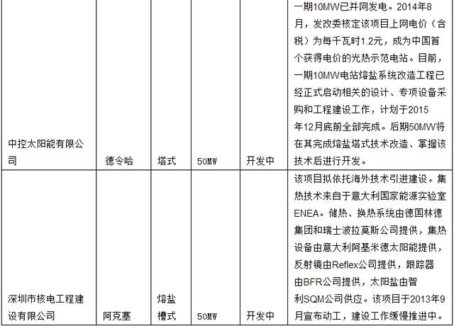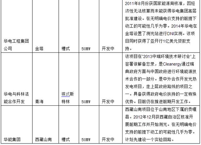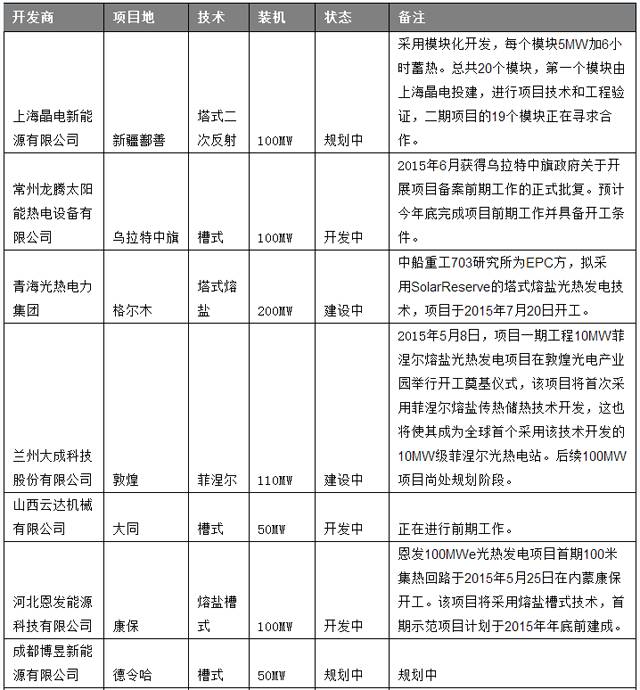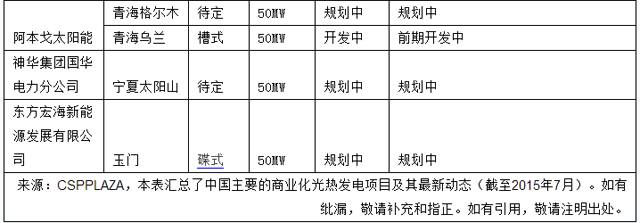 CSPPLAZA光热发电网讯:据CSPPLAZA统计,截至目前,中国正在建设、规划中和在开发的大型商业化光热发电项目的数量已近40个左右,总装机已超过3GW,但囿于尚不明朗的政策环境,绝大多数项目的实际推进十分缓慢,特别是央企主导的相关项目,明显受制于电价政策而徘徊不前。下表统计了中国商业化光热发电项目的进展情况(截至2015年7月)。