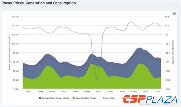 由于当天阳光明媚、狂风大作,在当地时间下午1点左右可再生能源共产生了55GW电力,占到全部用电量的87%。
